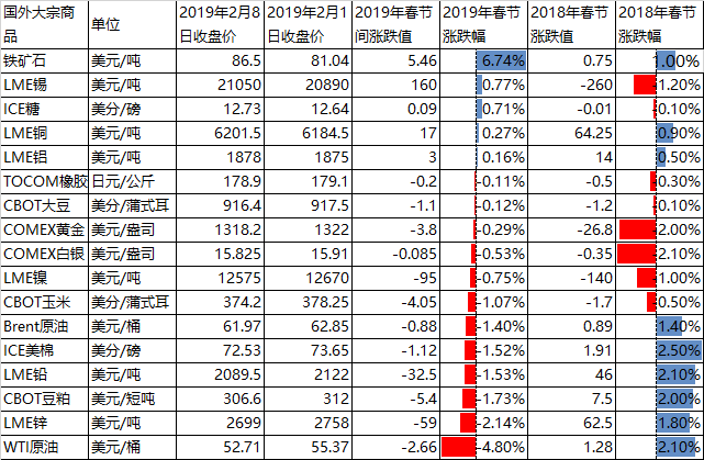 2019年春節(jié)期間,受對世界經濟增長放緩的擔憂大宗商品價格基本以小幅度下跌為主,其中尤以原油價格下跌為甚。