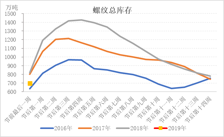 庫存低于去年同期,市場有望出現(xiàn)開門紅行情。根據Mysteel庫存統(tǒng)計數據,2019年春節(jié)前最后一周五大品種庫存雖高于2016年,但低于2017、2018年,尤其是螺紋鋼,總庫存低于2018年同期122萬噸。在產量高于去年同期的情況下,需求是好于去年同期的。市場對節(jié)后需求依舊抱有較大期待。