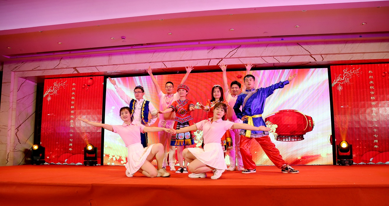 此次慶典晚宴參加人員除了信橋全體員工之外,還有部分老領導和老朋友,大家共同分享了信橋二十七周年的喜悅與精彩。八號上午,慶典開始之前,演員們辛勤排練,燈光師、音響師共同配合,所有人為了晚會都在努力。下午4點58分,晚會正式開始,全體員工與領導集體合影,信橋隊伍不斷在擴大。今年的晚會添加新的互動方式,采用了直播和紅包雨的新形式,是信橋周年慶典的一次新的嘗試。