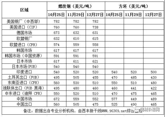In terms of billet prices: In December, the Turkish export offer(FOB) fell by $55 per ton compared with the same period in November, and the CIS export Black Sea offer(FOB) fell by $19 per ton; Middle Eastern imports fell by $10 per ton, while South-East Asian imports fell by $30 per ton.