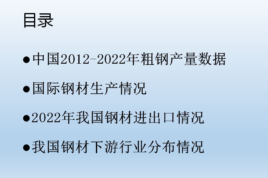 •我國現階段已經初步實現城鎮(zhèn)化的建設,隨著房地產需求的下滑,我們普通鋼材很難有一個大的增量,但是我國的特殊鋼材還有很大的發(fā)展空間。結合國家鋼材發(fā)展現狀,我們也慢慢的理解公司制定“高端、國有、人無我有”政策的現實依據,希望大家能出通過了解行業(yè)發(fā)展的方向,明確目標,開發(fā)客戶,更好的規(guī)劃自己的銷售,取得好的業(yè)績。